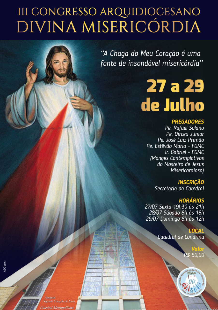 Nos dias 27 a 29 de julho será realizado na Catedral Metropolitana de Londrina o terceiro Congresso Arquidiocesano da Divina Misericórdia. O tema nesse ano é: “A chaga do meu coração é uma fonte insondável de misericórdia”.