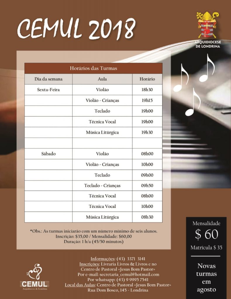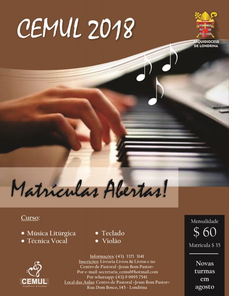 O CEMUL, escola de música da Arquidiocese de Londrina, encabeçada pela Pastoral da Música, está com inscrições abertas para novas turmas, com início em agosto. São turmas para os cursos de violão (para adultos e para crianças), teclado, técnica vocal e música litúrgica, com aulas ou na sexta-feira à noite ou no sábado de manhã no Centro de Pastoral Jesus Bom Pastor (Rua Dom Bosco, 145).