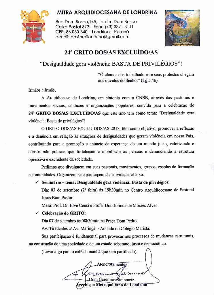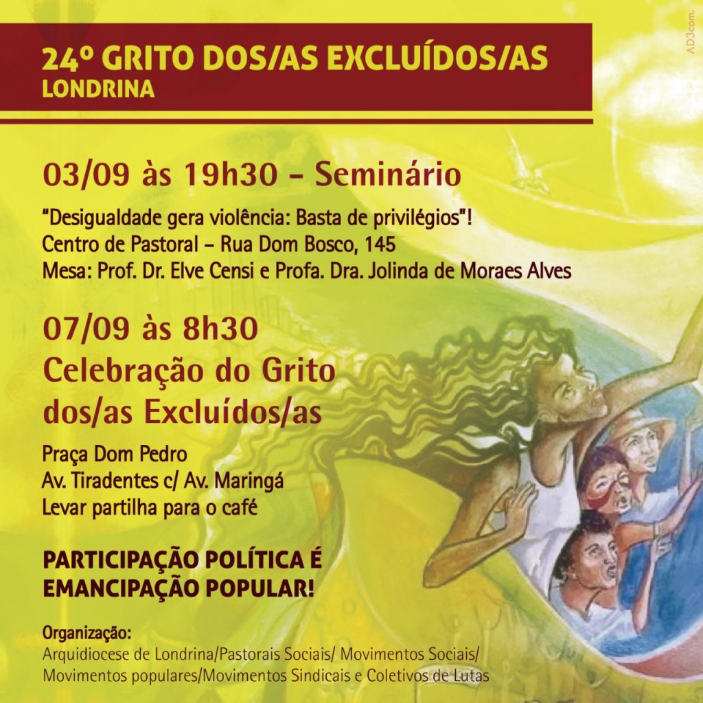 Carta convite para as atividades relacionadas às reflexões do 24º Grito dos Excluídos que neste ano tem como tema: “Desigualdade gera violência: Basta de privilégios”