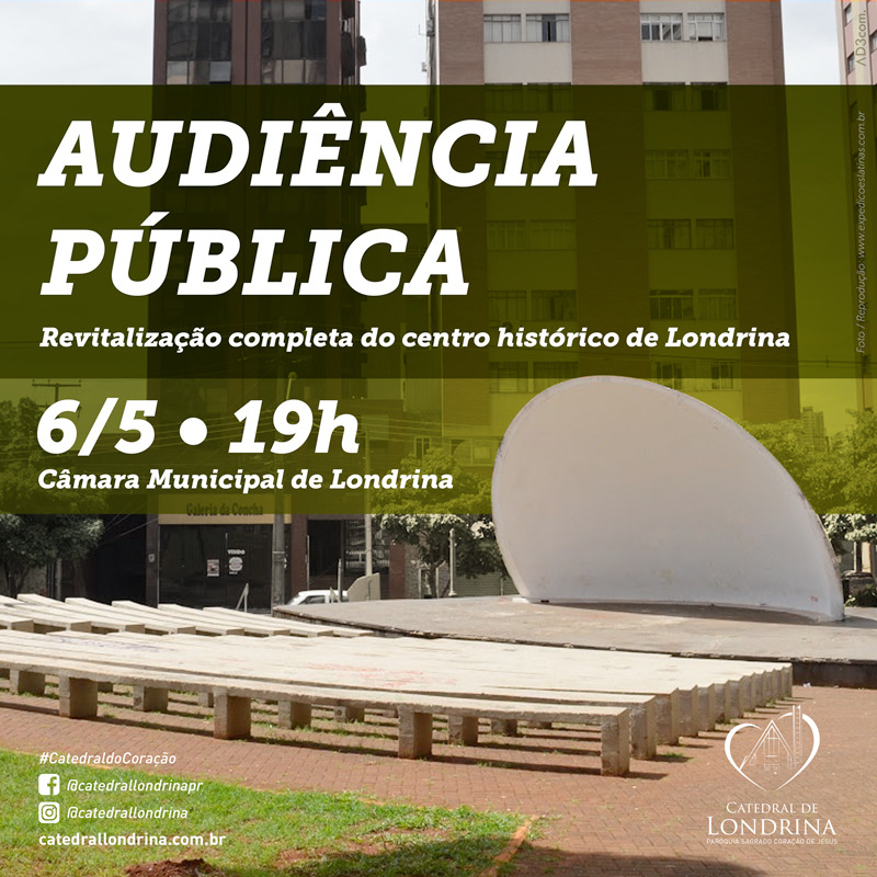 A Catedral Metropolitana de Londrina convida todos os leigos e leigas, lideranças de pastorais e movimentos e toda a comunidade para a Audiência Pública sobre a revitalização do centro histórico da nossa cidade na Câmara Municipal de Vereadores de Londrina nessa segunda feira, 06/05, às 19h00.