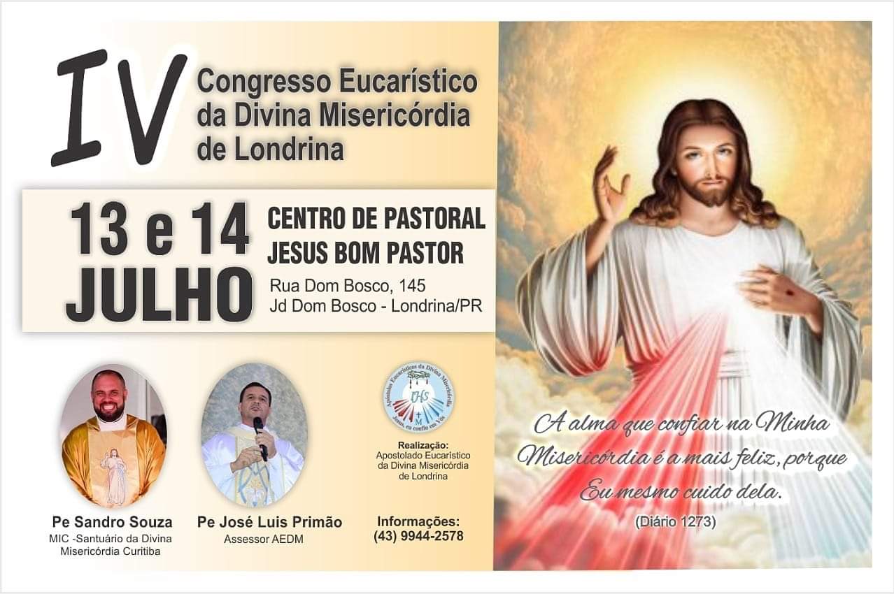O Apostolado da Divina Misericórdia de Londrina convida para o 4º Congresso Arquidiocesano da Divina Misericórdia, nos dias 13 e 14 de julho, no Centro de Pastoral Jesus Bom Pastor. Neste ano o congresso traz como tema: “A alma que confiar na Minha Misericórdia é a mais feliz, porque Eu mesmo cuido dela.”