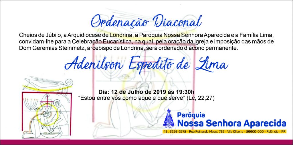 Cheios de júbilo, a Arquidiocese de Londrina, a Paróquia Nossa Aparecida de Rolândia e a família Lima convidam-lhe para a Celebração Eucarística na qual, pela oração da Igreja e imposição das mãos de Dom Geremias Steinmetz, arcebispo de Londrina, Adenilson Espedito de Lima será ordenado diácono permanente.