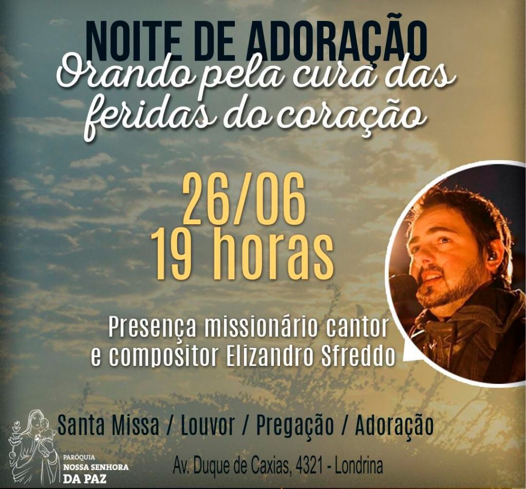 A Paróquia Nossa Senhora da Paz, Decanato Leste, convida a noite de adoração: Orando pela cura das feridas do coração, no próximo dia 26 de junho, com a presença do missionário e cantor Elizandro Sfreddo, membro de aliança da Comunidade Divino Oleiro, de Cambé.