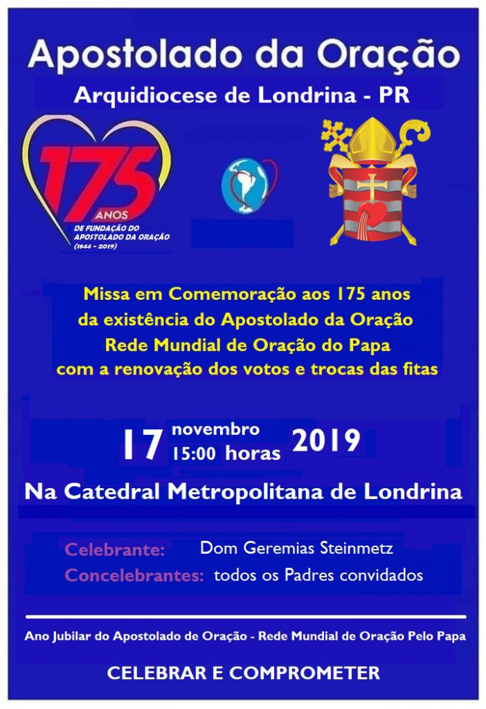 O Apostolado da Oração da Arquidiocese de Londrina convida para a Santa Missa em comemoração aos 175 anos de fundação do Apostolado da Oração – Rede Mundial de Oração do Papa, no domingo, 17 de novembro, às 15h na Catedral Metropolitana de Londrina.