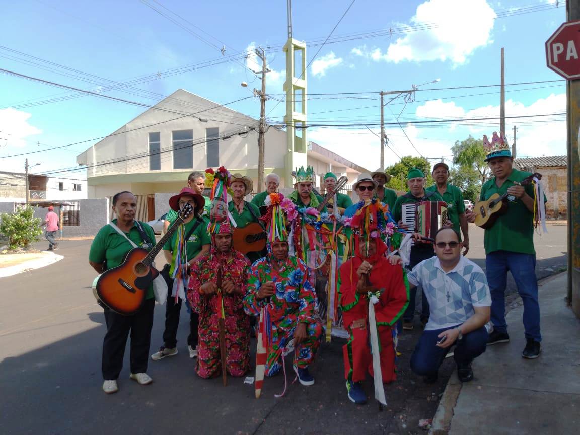Grupo de Folia de Reis “Menino Deus”, da Paróquia Nossa Senhora do Amparo, com o pároco, padre Lourival Zati