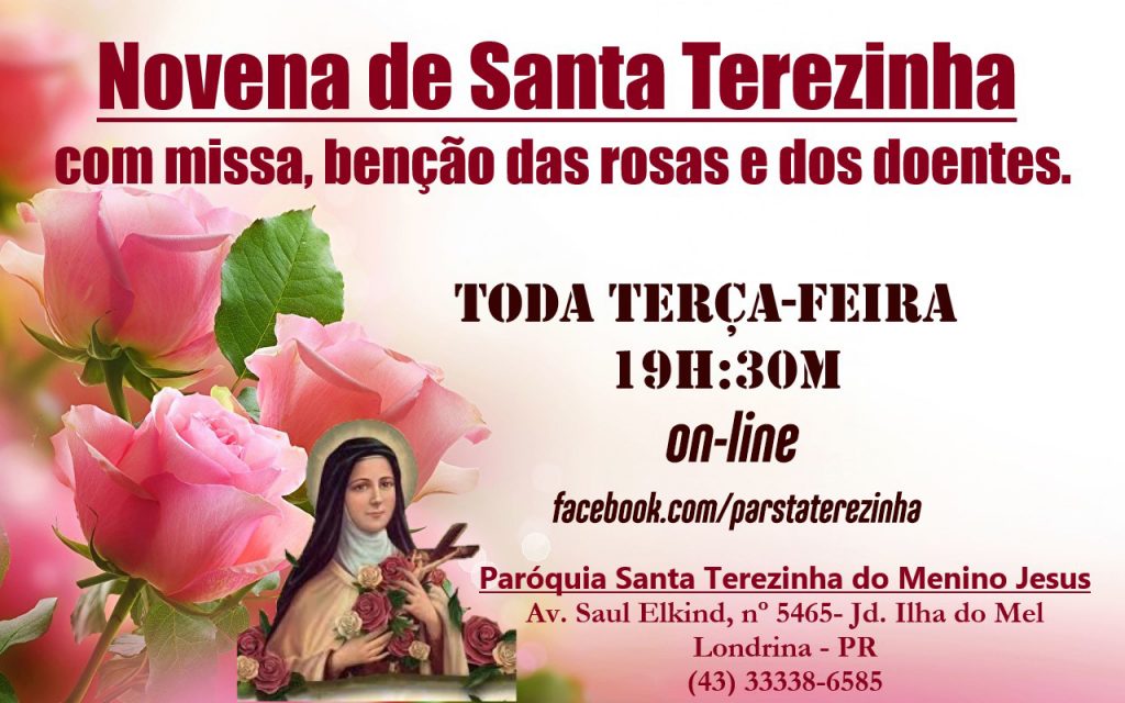 A Paróquia Santa Terezinha, do Decanato Norte, convida para a Novena Perpétua de Santa Terezinha, com missa, bênção das rosas e dos doentes, todas as terças-feiras, às 19h30, com transmissão ao vivo pelo Facebook da paróquia.