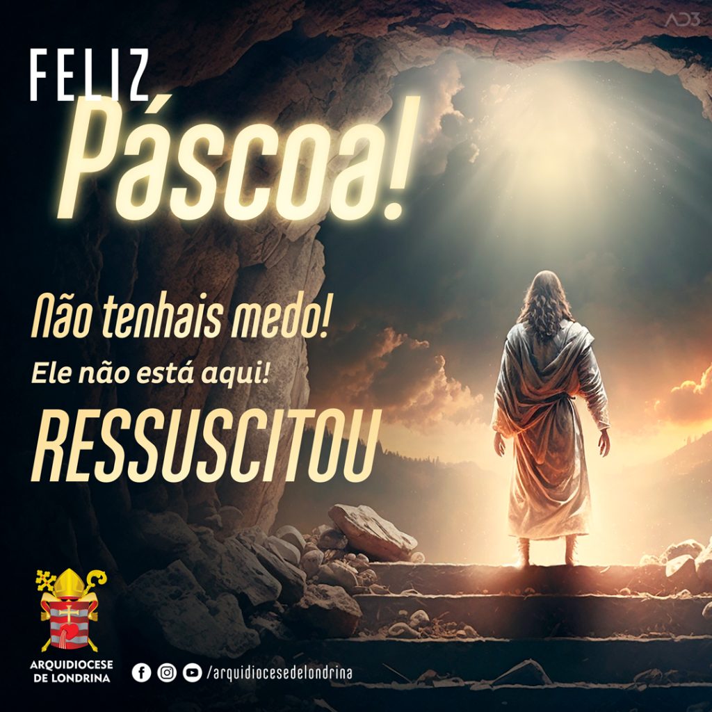 9 abril, 2023 #Compartilhe A Arquidiocese de Londrina deseja a todos uma feliz e santa Páscoa. Que sejamos um sinal para o mundo da luz que emana da presença do Cristo Ressuscitado. Não tenhais medo! Ele está aqui! Jornalismo Arquidiocese de Londrina