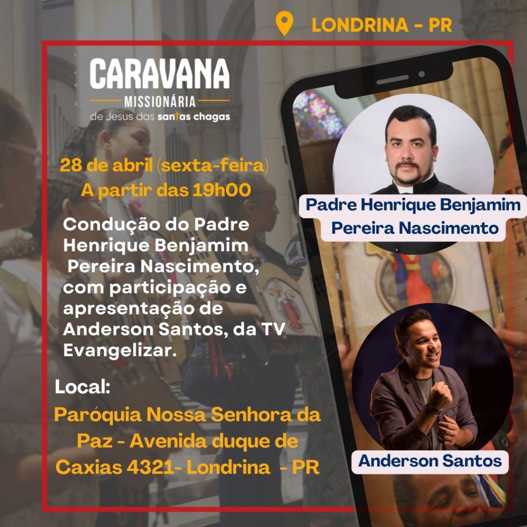 Nesta sexta-feira, 28 de abril a Paróquia Nossa Senhora da Paz do Decanato Leste recebe a Caravana Missionária de Jesus das Santas Chagas, a partir das 19h. O evento será conduzido pelo padre Henrique Benjamim Perereira do Nascimento e do apresentador da TV Evangelizar, Anderson Santos.