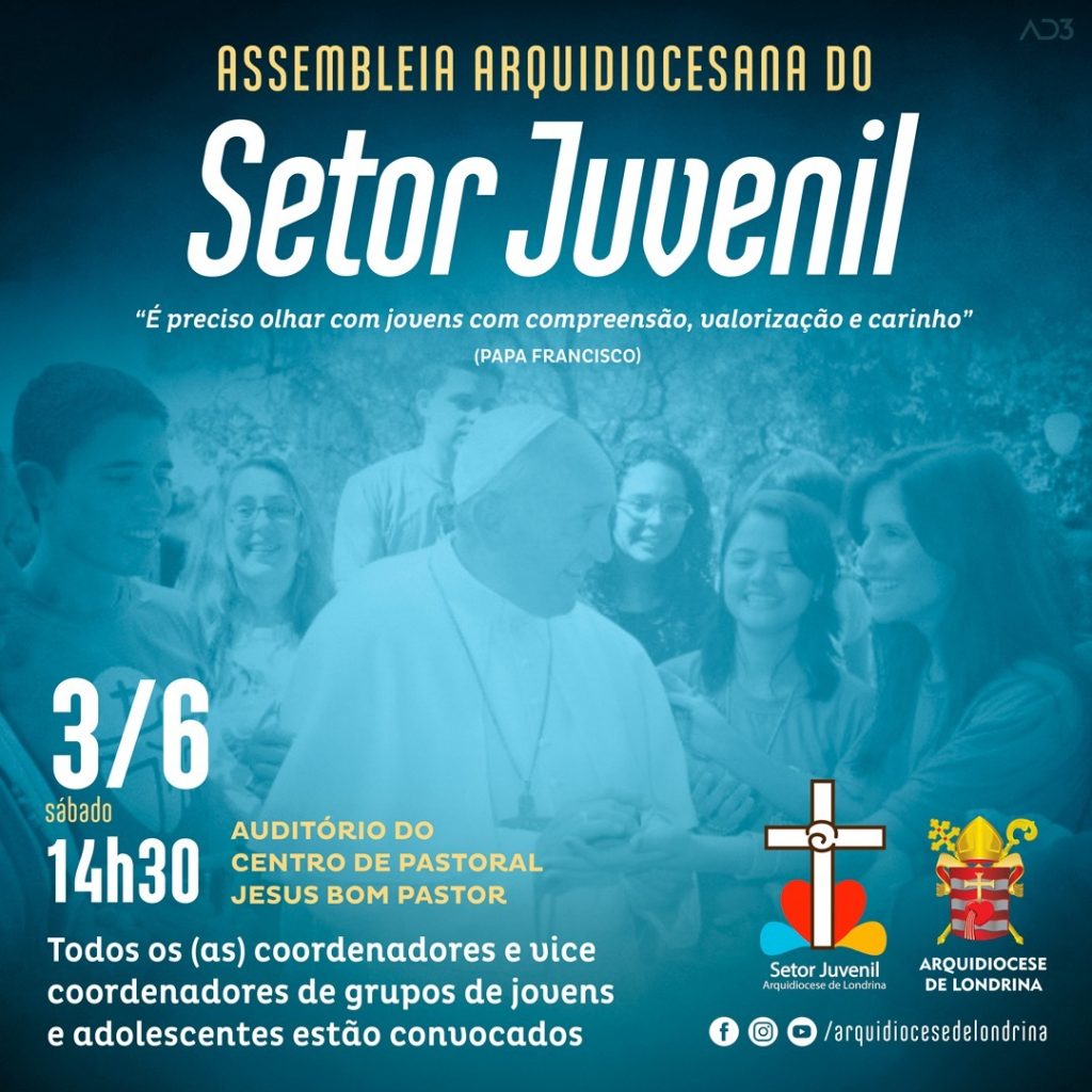 O Setor Juvenil da Arquidiocese de Londrina CONVOCA todos (as) coordenadores (as) e vice coordenadores (as) de grupos de adolescentes e jovens assim como todos os (as) coordenadores (as) arquidiocesanos de pastorais, movimentos e expressões juvenis da Arquidiocese de Londrina para a Assembleia Arquidiocesana do Setor Juvenil que será realizada no dia 03 de junho de 2023 (sábado) as 14h30 no auditório do Centro de Pastoral Jesus Bom Pastor.