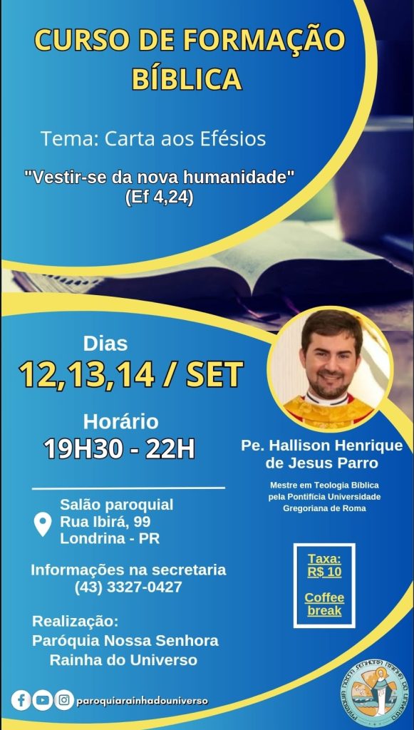 A Paróquia Nossa Senhora Rainha do Universo, no Decanato Centro, convida para o Curso de Formação Bíblica, baseada na Carta aos Efésios, tema do Mês da Bíblia deste ano.