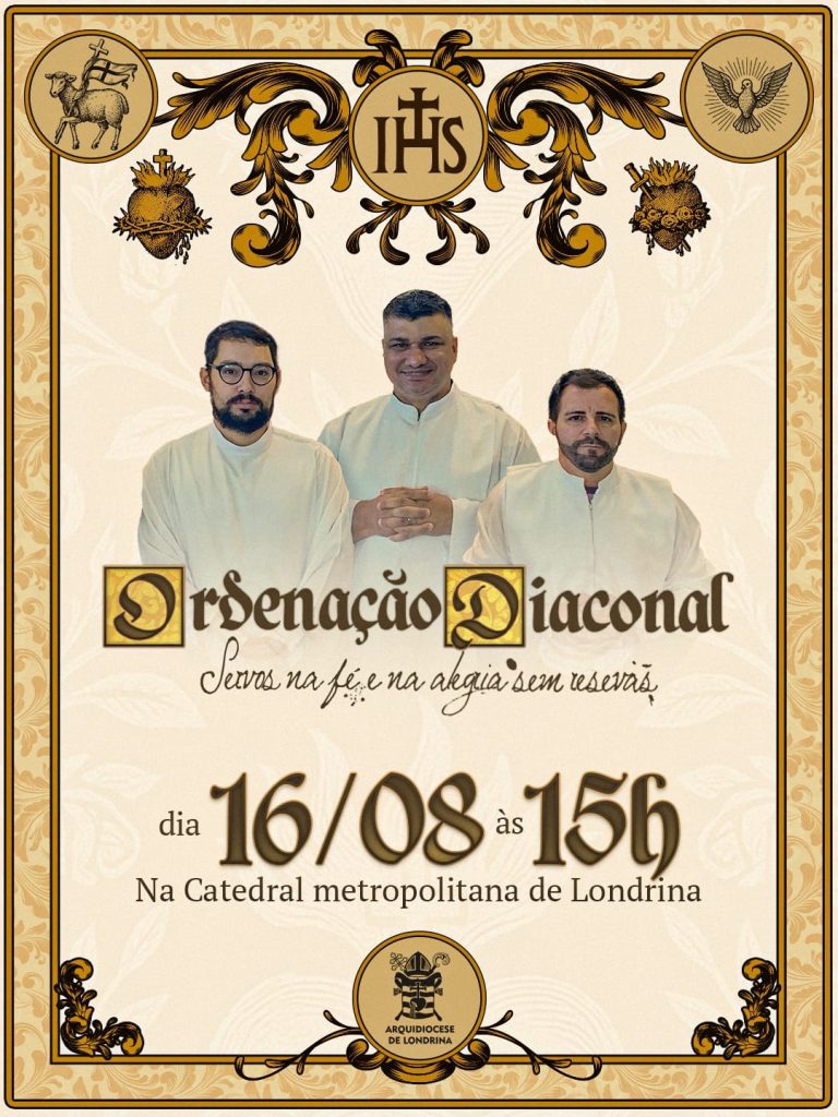 A Arquidiocese de Londrina, juntamente com os seminaristas Antonio Marcos Andreiw, Brayan Ávila e Marco Aurélio Malaquias e suas famílias convidam para a Solene celebração Eucarística de ordenação diaconal, no dia 16 de agosto, às 15h na Catedral Metropolitana.